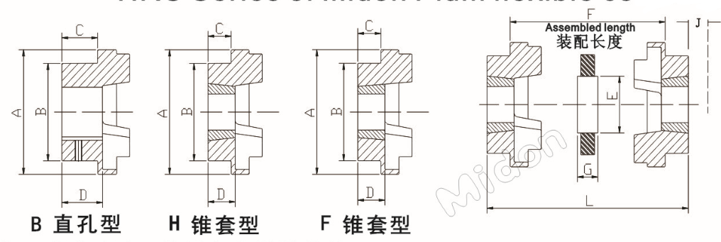 3、 聯(lián)軸器的內(nèi)徑分為:直孔式(B型)、錐孔式(F、H型),具有更換拆裝便捷準(zhǔn)確的優(yōu)點(diǎn)。