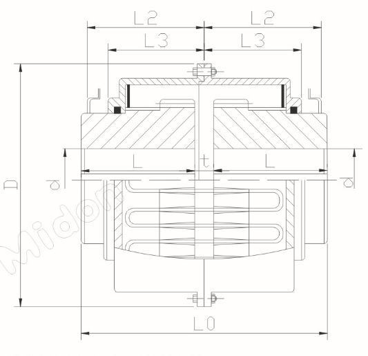 | 型號 | 公稱轉(zhuǎn)矩Tn KN.m | 許用轉(zhuǎn)速(n) r/min | 軸孔直徑 d | 軸孔長度 L | 總長度 L0 | L2 | L3 | D | 間隙 t | 重量 kg | 潤滑油 kg | 許用位移量 | ||